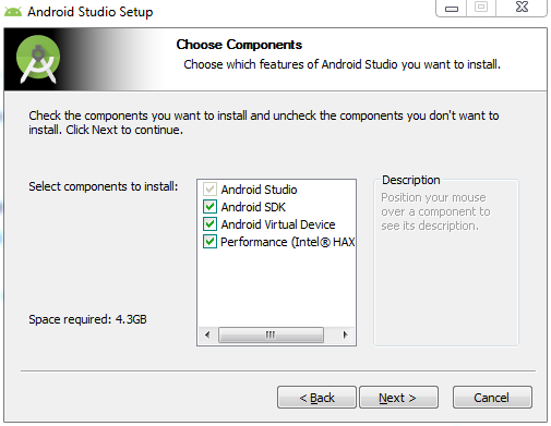 Verify that Android SDK; Android virtual device is checked in like the screenshot below.