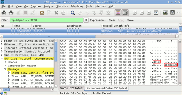 These protocols are defined on top of TCP/IP stack. Both DIAG and the RFC protocols do not support authentication and encryption while transmitting the data. What this means is an attacker who is present in the same network can simply see the passwords by sniffing the traffic. Unfortunately, tools such as Wireshark will not automatically sniff this traffic as it is compressed. However, there are SAP dissection plugins that you can install to see the traffic. Once installed the tool can dissect the main headers used by the DIAG protocol. Core Labs SAP dissection plug-in and SAP DIAG plugin by Positive Research Center are the two plugins available. Once the traffic is captured look for the destination IP address or usually for port 3200 as shown in the below screenshot. Other tools such as Cain & Abel, SapCap would also do this job.