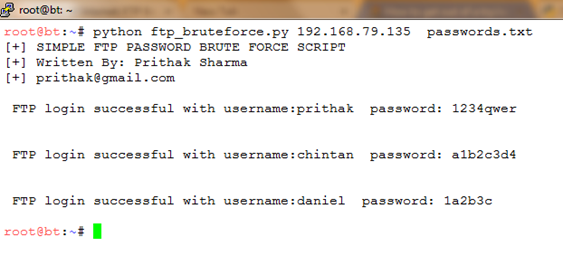 Using the above Python script, the password of the FTP users' prithak, chintan, and daniel were brute forced and obtained successfully. The following screenshot shows the password obtained:
