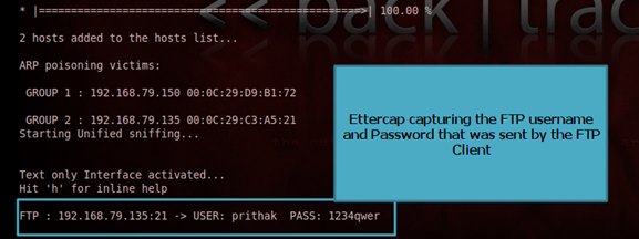 - Ettercap utility was used to launched an ARP poisoning attack against both the 192.168.79.150 [ Windows XP (FTP Client)] and the 192.168.79.135 ProFTP Server (FTP Server) . The following command was used: