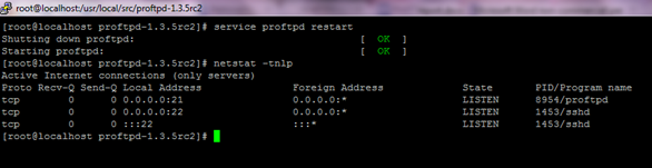 [5] Once the binaries were compiled, the location of proftpd was found out using the following command: # which proftpd The version was also checked using the following command: #/usr/sbin/proftpd –v