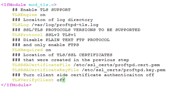 - The ProFTPD server was configured to support FTPS protocol by editing the /etc/proftpd.conf configuration file. Also, the plaintext FTP protocol was disabled and FTPS was enforced. Now ProFTPD will reject plaintext FTP connections. The following screenshot shows the added lines with comments and explanation: