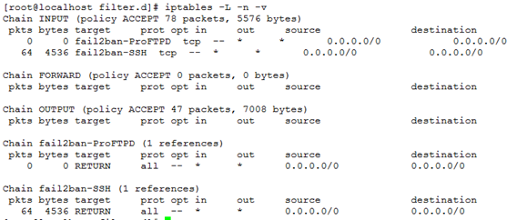 # /etc/init.d/fail2ban restart At the beginning, no IP address was blocked by fail2ban with the help from iptables. The default rule set in fail2ban-ProFTPD chain was empty as shown below: