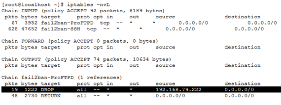 - The iptables rule to block the IP 192.168.79.222 that was inserted by fail2ban is highlighted below: