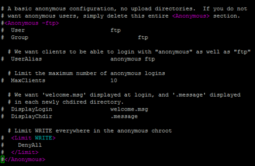 The same file has the configuration directive, starting with <Anonymous ~ftp> and ending with </Anonymous>, and all the directives inside it were commented out (by putting a hash sign in front of the configuration) to disable anonymous FTP service on the ProFTPD server.