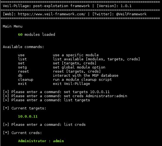 At the time of writing this article, there were 7 categories with total of 60 modules in Veil-Pillage.