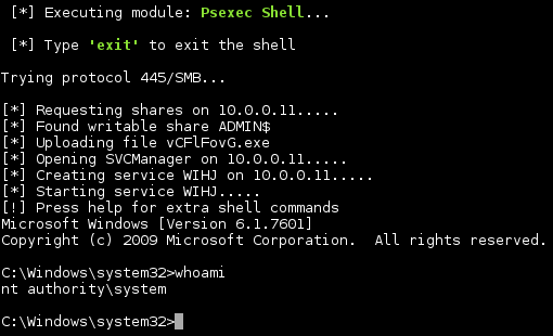 A successful SMB shell is shown below with some sample commands, which show you have full-fledged SMB shell access on the target machine.