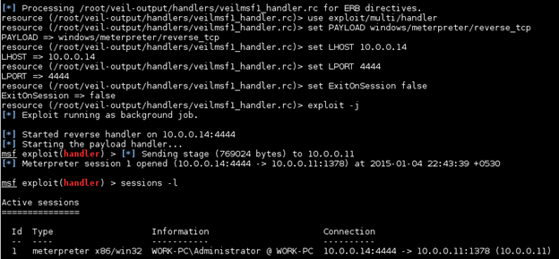 One of the modules of this category is "payload_delivery/exe_delivery" which can be used to upload an executable file and execute it on the victim machine. For this demo I am generating a Meterpreter EXE file using Veil-Evasion (part of the Veil-Framework). In the below image, you can see Veil-Evasion has generated a Meterpreter EXE along with a resource file (.RC).