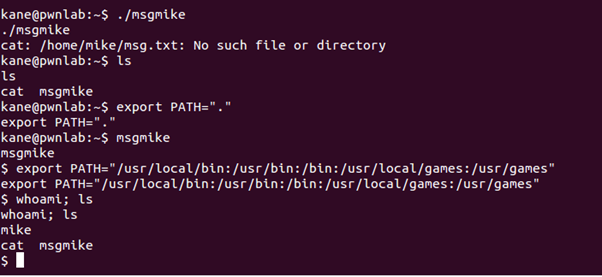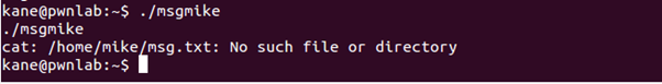 This let us know that the program is trying to call the cat command to view the contents of a file called msg.txt available under the home directory of a user called mike. Moreover, let's recall the the file is SUID. What should we do now?