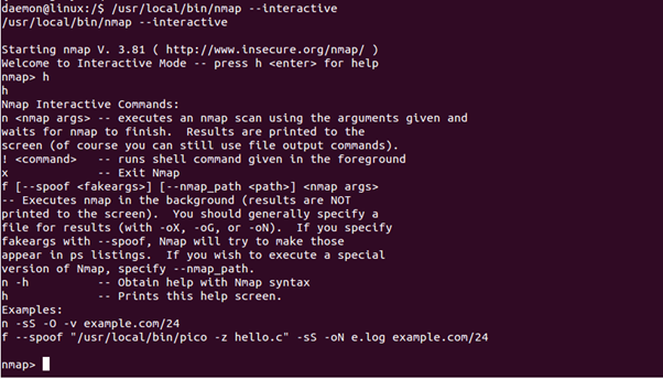 Back in the day, Nmap supported an option called "interactive." With this option, users were able to execute shell commands by using a nmap "shell" (interactive shell). Many times, security researchers were using this option to avoid logging their nmap commands in the bash history log file. Here is how nmap interactive looks like: