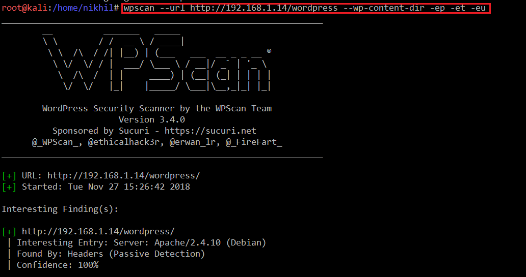 Command Used: << wpscan --url http://192.168.1.14/wordpress --wp-content-dir -ep -et -eu >>