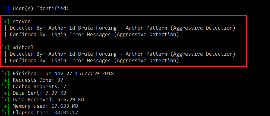 The scan returned a large output. After analyzing all the results I found two usernames to log into WordPress, which can be seen in the screenshot given below.