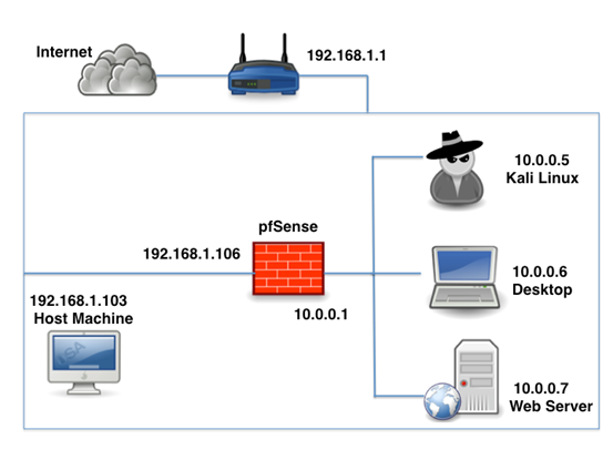 External Pentest – Web Server is kept behind the firewall. Thoughfirewalls cannot be used to stop web attacks, since port 80/443 is opened for obvious reasons. Firewall and the private network can be accessed from users connected to the same network (Wi-Fi router) or from the host machine.