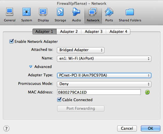 By default, Adapter 1 is attached to NAT in Virtual box. Change "Adapter 1" from "NAT" to "Bridged Adapter". This is the public facing interface for pfSense.