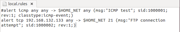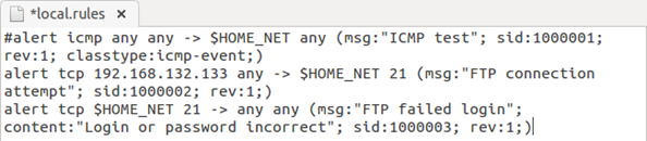 alert tcp 192.168.x.x any -> $HOME_NET 21 (msg:"FTP connection attempt"; sid:1000002; rev:1;)