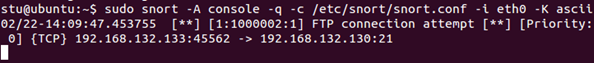 Here we changed the protocol to TCP, used a specific source IP, set the destination port number to 21 (default port for FTP connections) and changed the alert message text. Save and close the file. Now let’s run Snort in IDS mode again, but this time, we are going to add one more option, as follows: