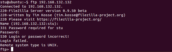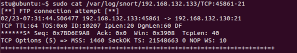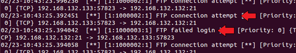 To make sure that the rule is not generating any false positives, you can open another terminal shell on Ubuntu Server VM and try connecting to the same FTP server. You shouldn’t see any new alerts. Hit Ctrl+C to stop Snort.