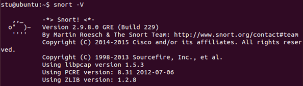 You have Snort version 2.9.8 installed on your Ubuntu Server VM. Launch your Ubuntu Server VM, log on with credentials provided at the beginning of this guide and open a terminal shell by double-clicking the Desktop shortcut. (Alternatively, you can press Ctrl+Alt+T to open a new shell.)
