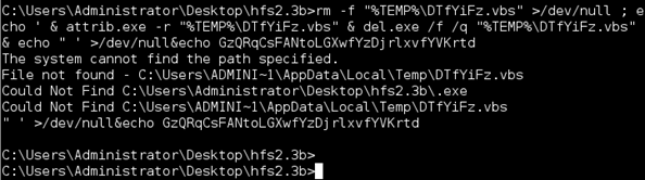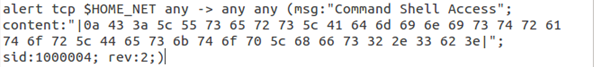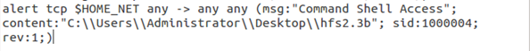 alert tcp $HOME_NET any -> any any (msg:"Command Shell Access"; content:"C:UsersAdministratorDesktophfs2.3b"; sid:1000004; rev:1;)