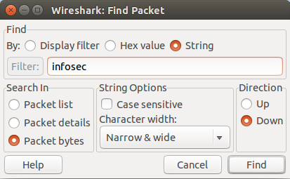We need to find the ones related to our simulated attack. In Wireshark, select Edit → Find Packet. On the resulting dialog, select the String radio button. Next, select Packet Bytes for the Search In criteria. Then, for the search string, enter the username you created.