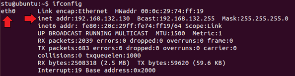 Next, we need to configure our HOME_NET value: the network we will be protecting. First, enter ifconfig in your terminal shell to see the network configuration. Note the IP address and the network interface value. See the image below (your IP may be different).
