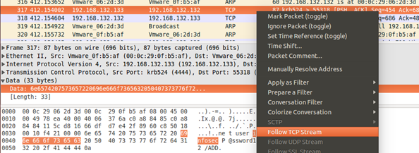 Once you’ve got the search dialog configured, click the Find button. The search should find the packet that contains the string you searched for. Go ahead and select that packet. It will be the dark orange colored one. Right-click it and select Follow TCP Stream.