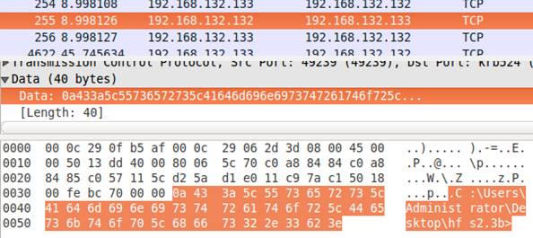 After you’ve verified your results, go ahead and close the stream window. This should take you back to the packet you selected in the beginning. Now hit your up arrow until you see the ASCII part of your hex dump show “C:UsersAdministratorDesktophfs2.3b>” in the bottom pane. See below.