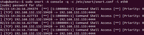sudo snort -A console -q -c /etc/snort/snort.conf -i eht0