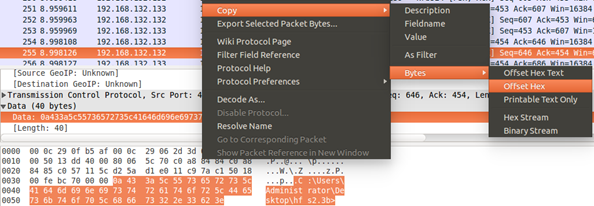Bring up the Wireshark window with our capture again, with the same payload portion selected. Unfortunately, you cannot copy hex values directly from the Wireshark’s main window, but there is an easy solution that will work for us. With the needed content selected, right-click either the corresponding (highlighted) packet in the top pane or the highlighted “Data:” entry in the middle pane and select Copy → Bytes → Offset Hex. See below.