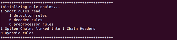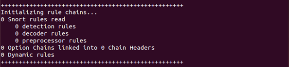 Here we are telling Snort to test (-T) the configuration file (-c points to its location) on the eth0 interface (enter your interface value if it’s different). This will produce a lot of output. Scroll up until you see “0 Snort rules read” (see the image below).