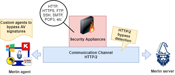 Figure 1: High-level diagram of Merlin cross-platform post-exploitation over HTTP/2 protocol, bypassing network detection mechanisms and AV signature detection.