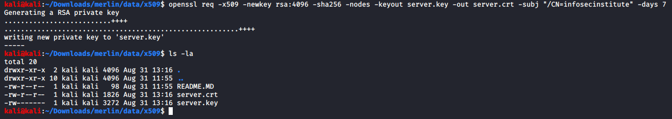 :> openssl req -x509 -newkey rsa:4096 -sha256 -nodes -keyout server.key -out server.crt -subj "/CN=infosecinstitute" -days 7