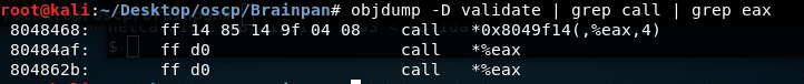 14. We need to identify the CALL EAX instruction in the binary. For that we will use the objdump utility in Kali and grep for call eax. We have couple of hits, as shown below. We will use 0x080484af.