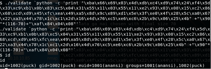 1. There is another binary on the system named validate, as shown below. Notice that this binary is owned by user anansi, so we will almost get the shell under anansi. But we know from Method 1 that there is an interesting utility under user anansi that is running as root.