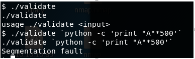 2. Running the validate binary, it looks like it needs input. So let’s try with buffer of “A” in this case, and we get a segmentation fault.