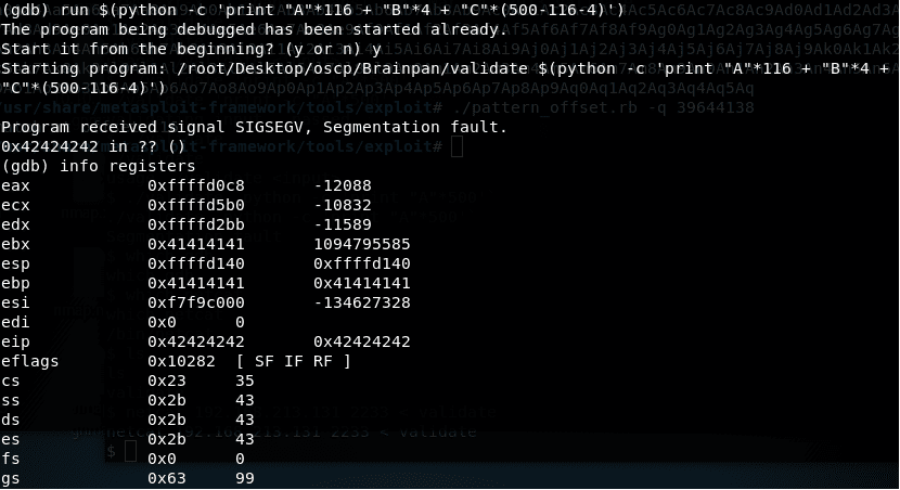 5. From the initial testing, we know that the segmentation fault is caused with an input buffer of 500 As, so we used pattern_create in Kali to create a pattern of 500 characters in length and passed it to the binary. Below, we can see the debugging in GDB.