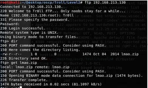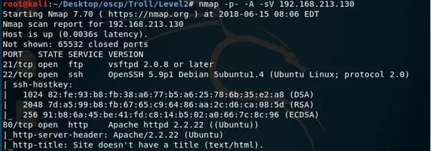 - As is the norm, we ran Nmap scans on all ports (since this is a troll, so not taking any chances). We got hits on 21, 22 and 80 (and robots.txt as well).