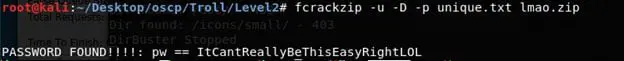 - Let's use fcrackzip (excellent utility) and pass it the unique .txt file generated earlier and the zip file. Below, we can see that we got a hit.