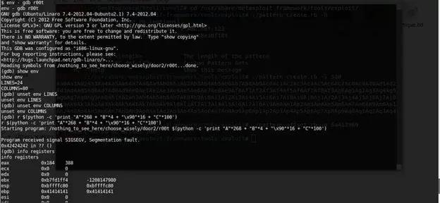 - Debugging the application within GDB shows that the EIP is overwritten by a value (possibly some part of our random characters).