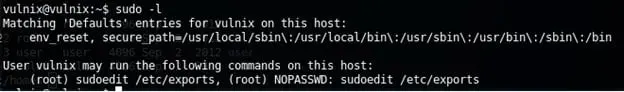 17. After logging onto the system, one of the first commands I always run is to check what the user can run as sudo. Below we can see that the user is allowed to edit /etc/exports.