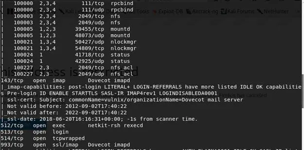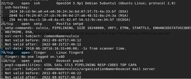 3. Now since we know the IP address, let's start enumerating the machine with Nmap. Below is the initial output from the Nmap scan. We can see that lot of ports are opened on this machine such as 22, 25, 79, 110, 143, 512, 513 and so on.