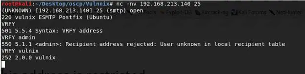 4. Since port 25 is opened, let's try to make connection to it using Netcat. Below is an output for the same. We have also confirmed that Vulnix is a user present on the machine: