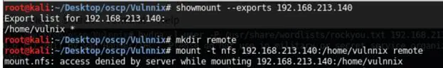 9. Using showmount with the --exports option we can see that we have a share. Let's try to mount it. For that I have created a directory named remote and used the mount command to mount the remote share, but all we got was permission denied. (This is mostly due to the root squash flag bit set). But what if we try to access the same share with same user ID remotely?