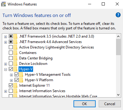 Now, select Hyper-V, and its subsections, as shown in the figure below.