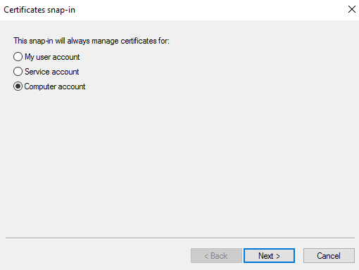 Under This snap-in will always manage certificates for, click Computer account, and then click Next.