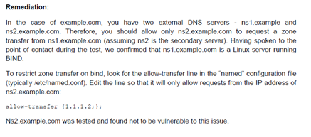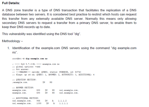 Of course, you could always ask your client how they would like vulnerabilities grouped. After all, the test is really for their benefit and they are the people paying! Some clients prefer to have a page detailing each vulnerability, with affected assets listed under the vulnerability title. This is useful in situations where separate teams may all have responsibilities for different areas of a single asset. For example, the systems team runs the webserver, but the development team writes the code for the application hosted on it.