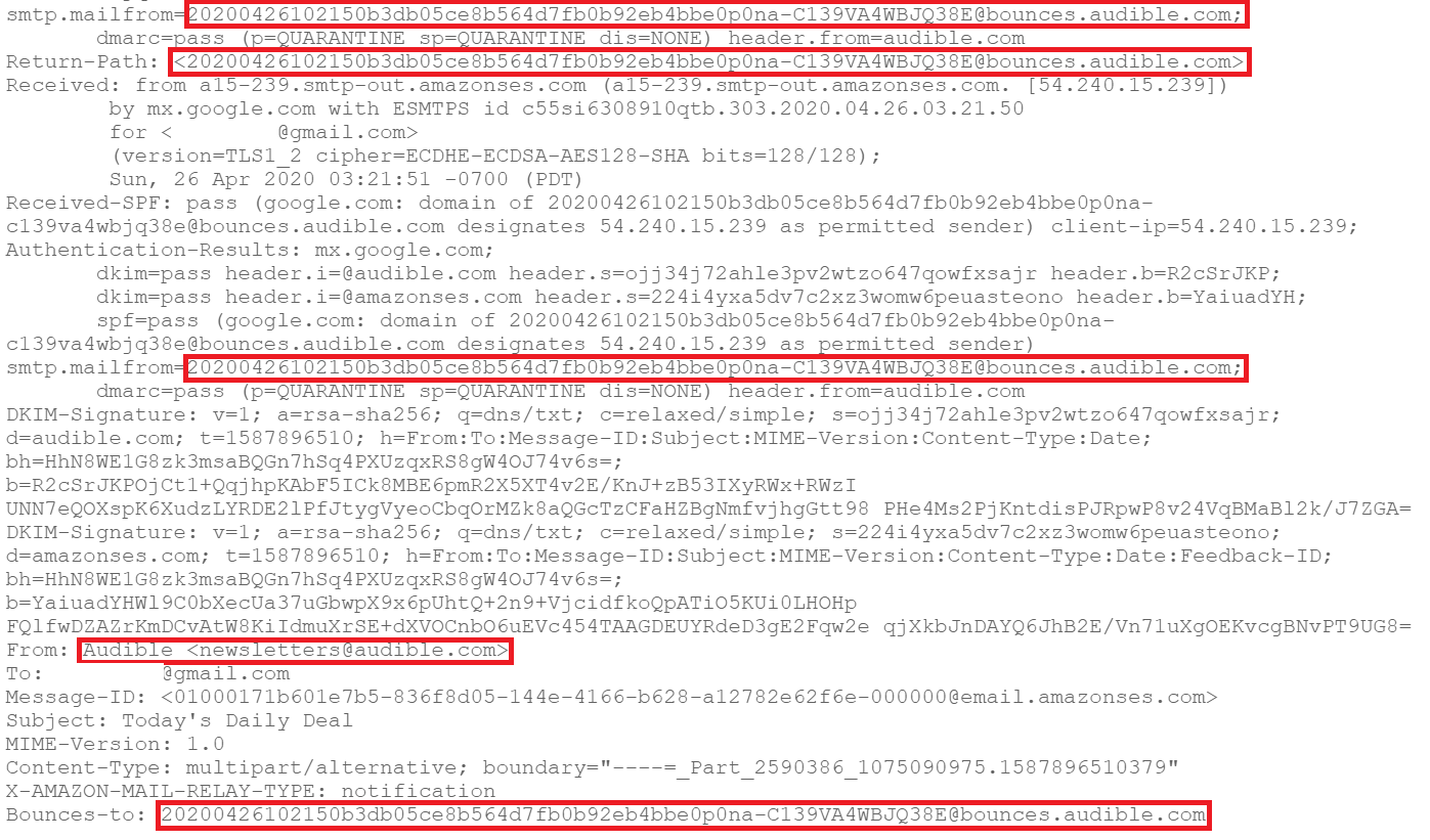 The screenshot above is from a mailer from Audible, Amazon’s audiobook company, listing the day’s daily audiobook deal. A number of different header values in this email should display the sender address, including:
